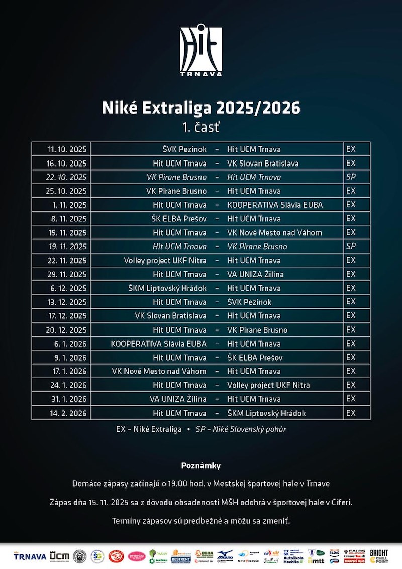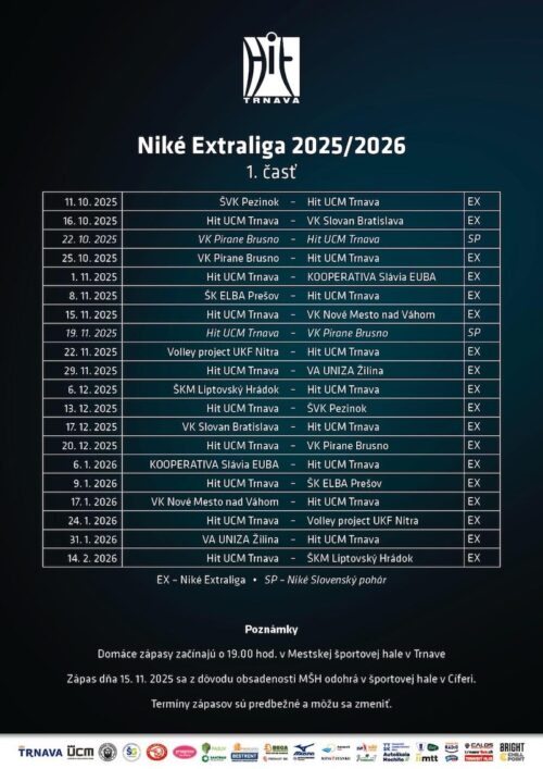 Pred domácimi divákmi sa predstavia netradične vo štvrtok 16. októbra od 19.00 hod. proti úradujúcemu majstrovi Slovenska VK Slovanu Bratislava (bývalé VKP Bratislava). Program turnaja ako aj termíny zápasov Hit UCM Trnava v 1. časti Niké extraligy posielame v prílohe.