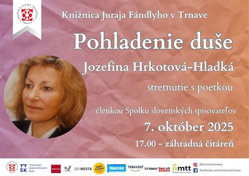 Knižnica Juraja Fándlyho v Trnave pozýva 7. októbra 2025 o 17.00 hodine priaznivcov poetického slova na stretnutie s poetkou Jozefínou Hrkotovou-Hladkou.