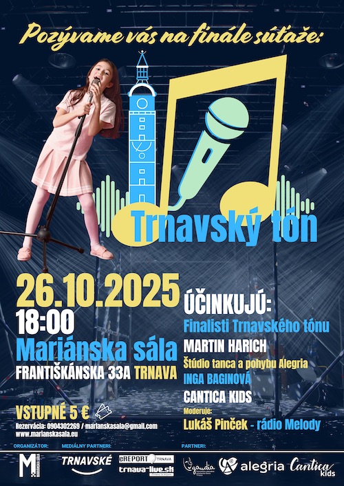 V Trnave sa uskutoční finále prvého ročníka speváckej súťaže Trnavský tón, ktorá vznikla s cieľom podporiť mladé hudobné talenty z regiónu. Finálový večer sa odohrá v nedeľu 26. októbra 2025 o 18:00 v Mariánskej sále a predstaví najlepších súťažiacich z dvoch vekových kategórií.