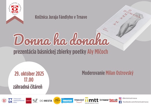 V stredu 29. októbra 2025 bude hosťom Knižnice Juraja Fándlyho v Trnave poetka s osobitým rukopisom a štýlom Ala Mlčoch, ktorá v záhradnej čitárni predstaví svoju knihu Donna ha donaha. Ide o osobitú výpoveď, ktorá zaujme slovnými hračkami a bohatým metaforickým jazykom.