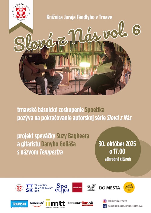 Knižnica Juraja Fándlyho v Trnave pozýva svojich priaznivcov aj na ďalšie stretnutie s trnavským poetickým zoskupením Spoetika. V júli tohto roku sa predstavili návštevníkom knižnice po prvýkrát a zožali veľký úspech.