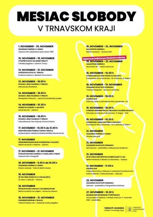 „Udalosti 17. novembra 1989 boli prejavom občianskej odvahy, ktorý viedli k politickému zlomu. Ľudia vyšli do ulíc, aby si vybojovali právo na slobodný názor, na demokratické voľby, na dôstojnosť a na pravdu. Dnes, po tridsiatich šiestich rokoch, sa musíme stále pýtať, ako s touto slobodou narábame. Sloboda bez zodpovednosti sa rýchlo mení na chaos a nezáujem. Preto je dôležité, aby sme ju napĺňali obsahom – každodennou úctou k druhým, ochotou pomáhať a aktívnym záujmom o veci verejné. Tieto sa snažíme podnietiť sériou verených podujatí v rámci Mesiaca slobody v Trnavskej župe,“ uviedol trnavský župan Jozef Viskupič s tým, že župný úrad aj organizácie zostanú v pondelok zatvorené.