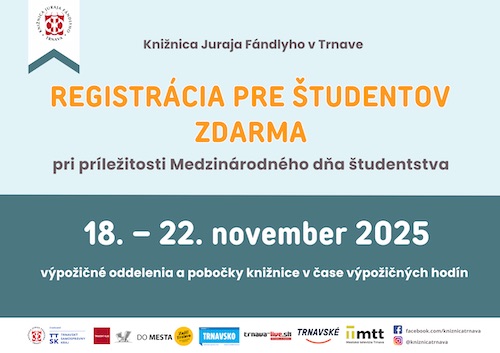 Knižnica Juraja Fándlyho v Trnave pri príležitosti Medzinárodného dňa študentstva ponúka študentom a študentkám REGISTRÁCIU DO KNIŽNICE ZDARMA!