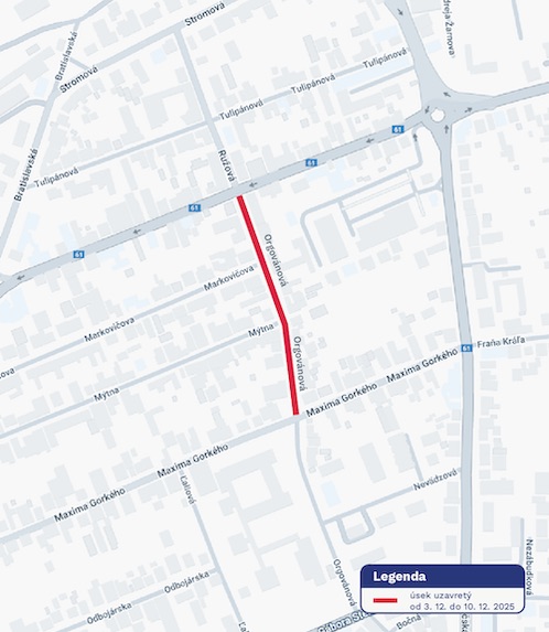 Časť Orgovánovej ulice od križovatky s ulicou 9. mája po križovatku s ulicou Maxima Gorkého bude preto uzatvorená.