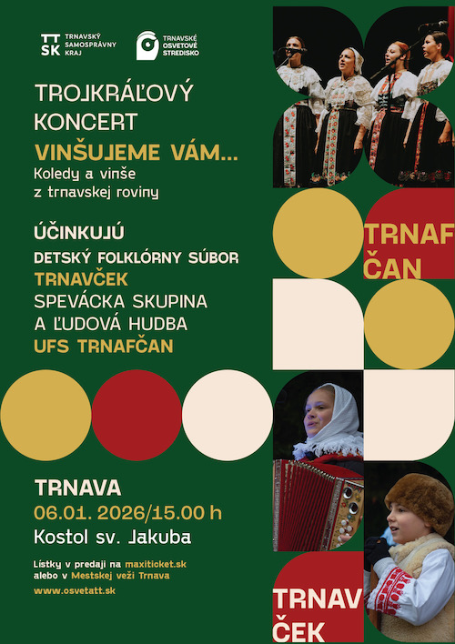 Trnavský samosprávny kraj a Trnavské osvetové stredisko pozývajú na Trojkráľový koncert „Vinšujeme vám…“ plný vianočných kolied a piesní s posolstvom nádeje a pokoja popretkávaný vinšami pre zdravie, šťastie, hojnosť a lásku.