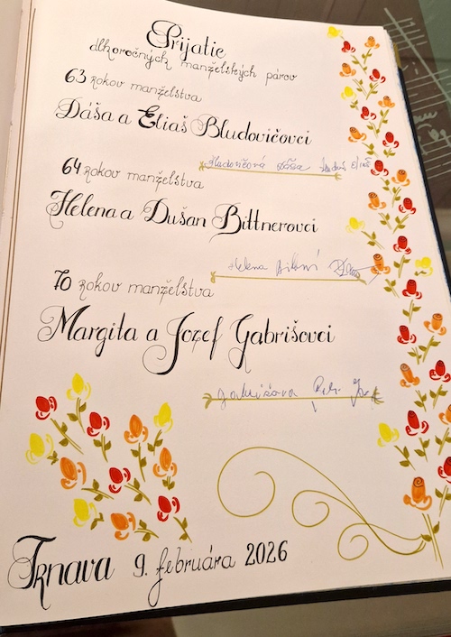 Oceňovanie dlhoročných manželstiev na trnavskej radnici, 9. februára 2026