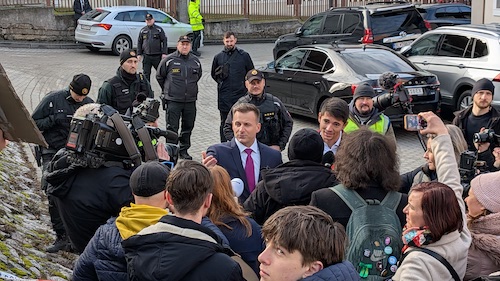 „Po ôsmich rokoch sa pýtam, či pán premiér už vypovedal. Sme tu preto, lebo pán premiér vďaka Bohu rád diskutuje so študentmi. Pýtam sa, keď má už osem rokov zamlčané informácie o tom, kto zavraždil Jána Kuciaka, prečo mešká osem rokov a kde berie tú drzosť stretávať sa so študentmi týmto spôsobom, keď nie je ochotný vypovedať o vražde jedného z našich najlepších učiteľov na Slovensku?“