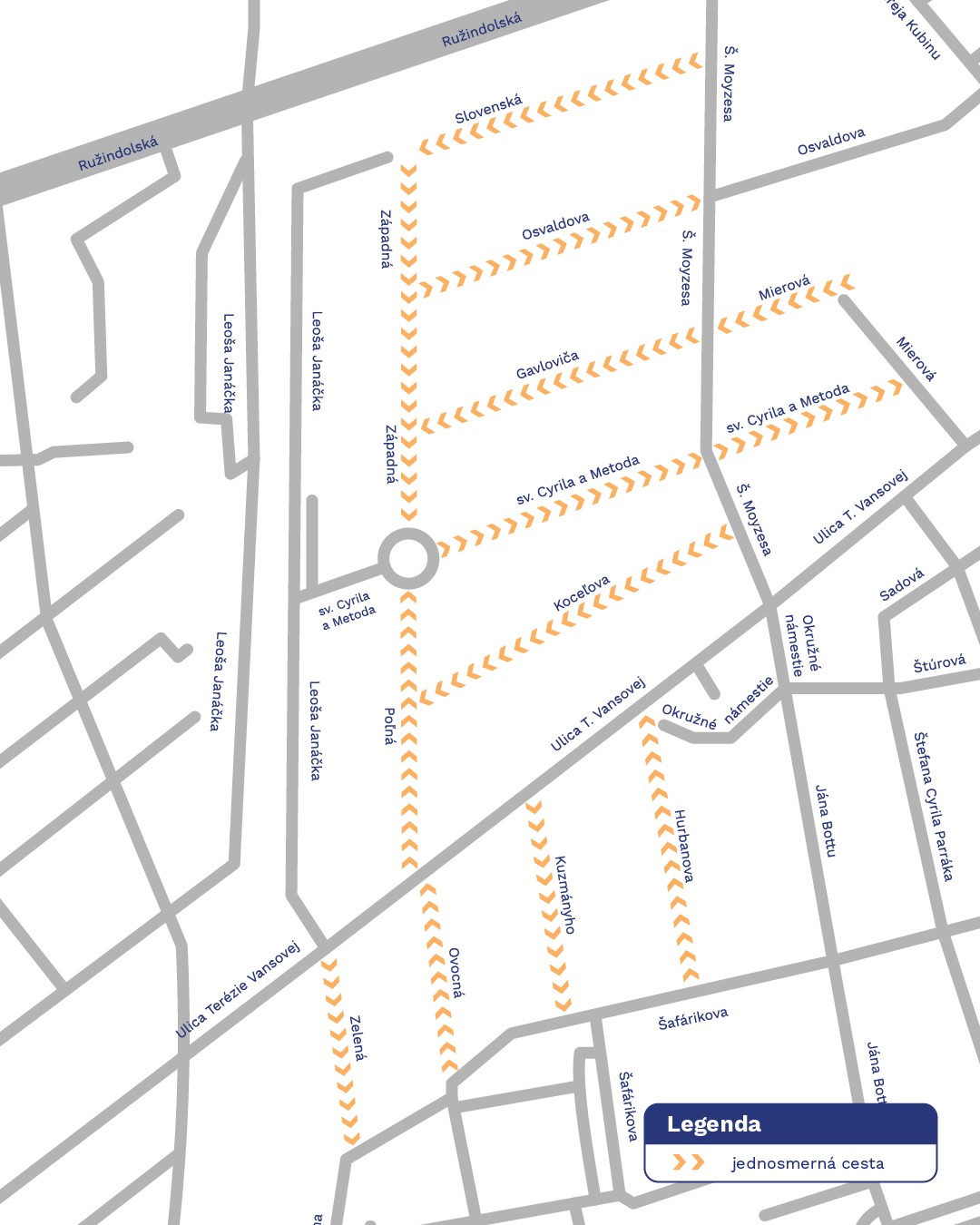 Sv. Cyrila a Metoda – obojsmerná v úseku medzi Ulicou Leoša Janáčka a Poľnou, zjednosmernená v úseku medzi Západnou a Ulicou Štefana Mozyesa,