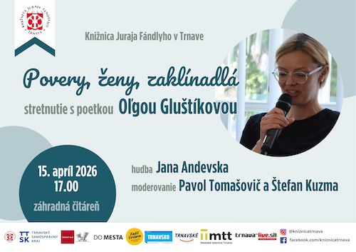 Knižnica Juraja Fándlyho v Trnave pozýva 15. apríla 2026 o 17.00 hodine na stretnutie s poetkou, publicistkou, redaktorkou a recenzentkou Oľgou Gluštíkovou.