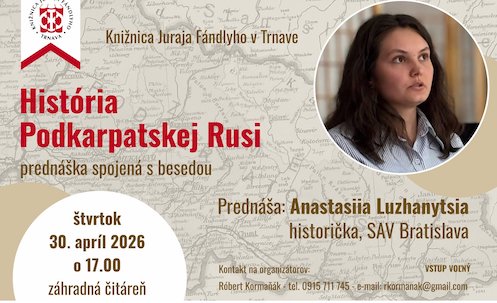 Vo štvrtok 30. apríla 2026 o 17, 00 hodine pozýva Knižnica Juraja Fándlyho v Trnave na prednášku s historickou témou. Prednášať bude historička a pracovníčka Historického ústavu SAV v Bratislave Anastasiia Luzhanytsia.