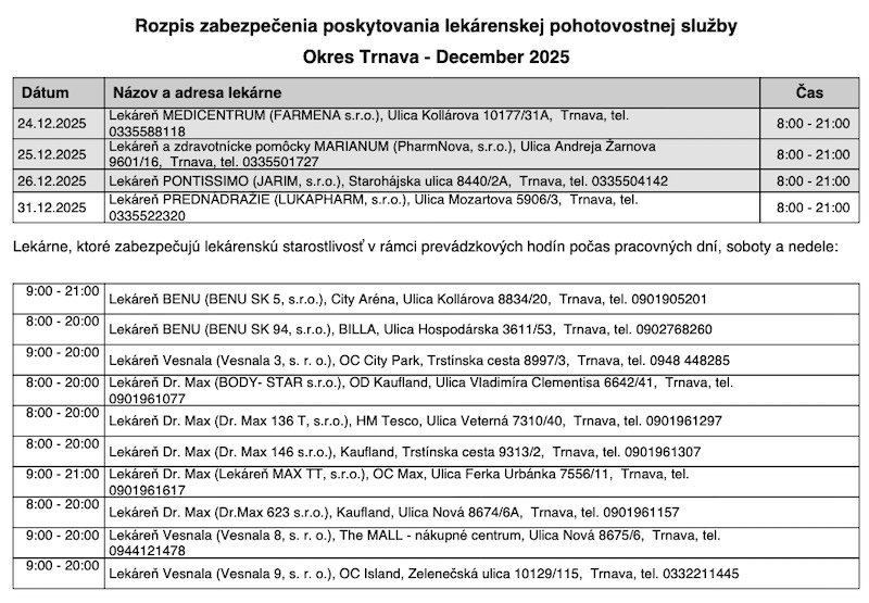 Rozpis pohotovostných služieb lekární v Trnave – NOVEMBER 2025